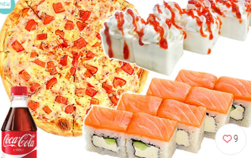 Состав: Пицца маргарита 25 см, ролл филадельфия, клубничный ролл и кола добрый 0,5 л