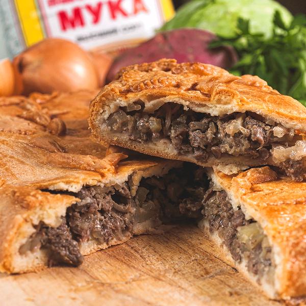 Состав: Тесто (дрожжевое/слоеное), мясо (свинина) рубленое, лук репчатый, сливочное масло, соль, перец черный, тмин.