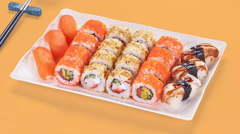 Состав: Калифорния с лососем (8 шт.), Бонито с креветкой (8 шт.), Суши с лососем (3 шт.), Суши с угрем (3 шт.) *Не забудьте заказать имбирь, васаби и соевый соус. Они не входят в стоимость заказа.